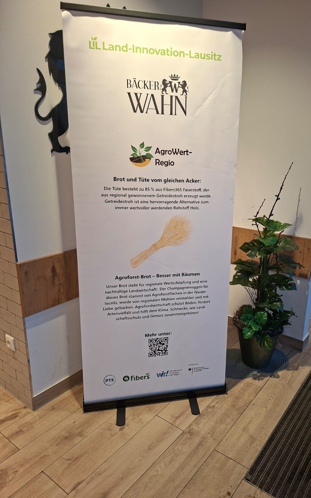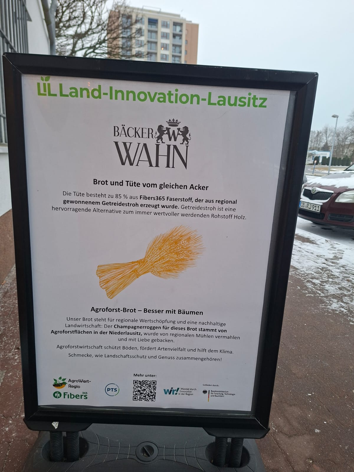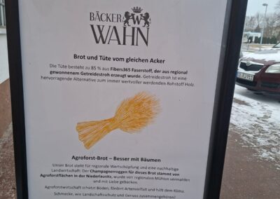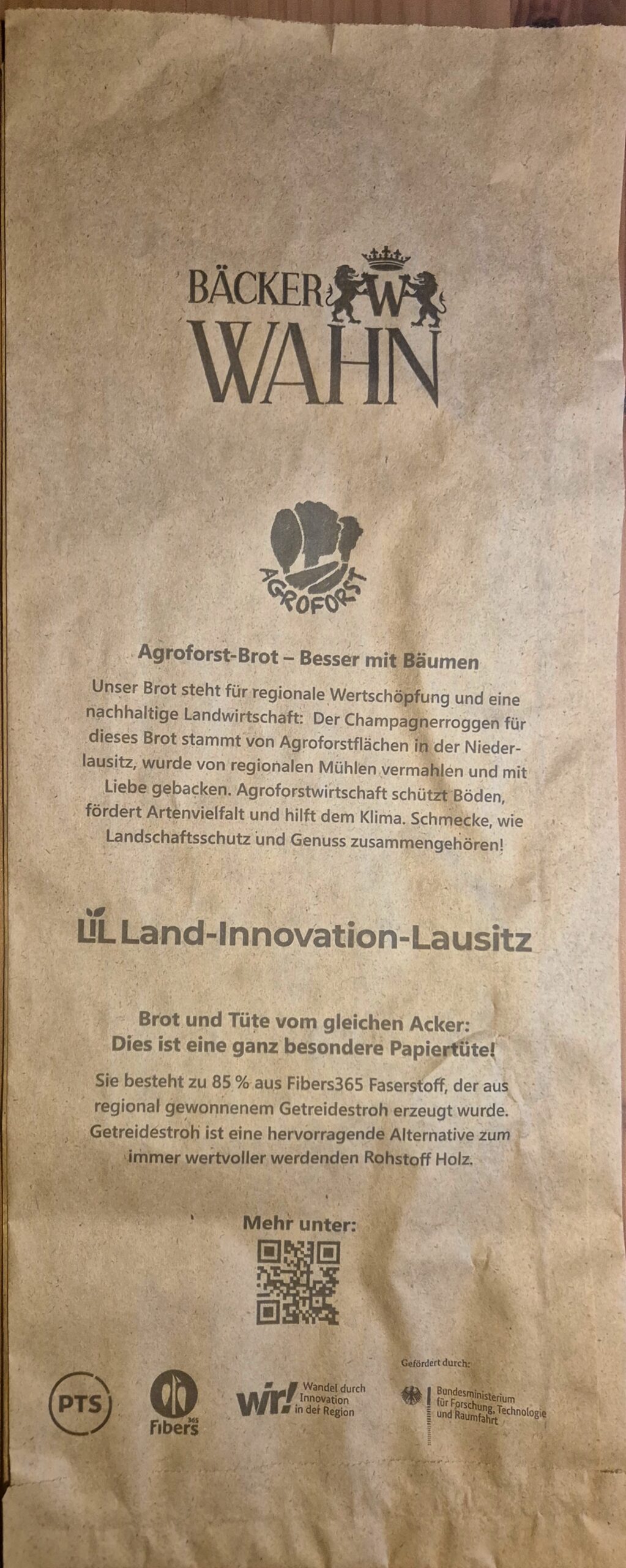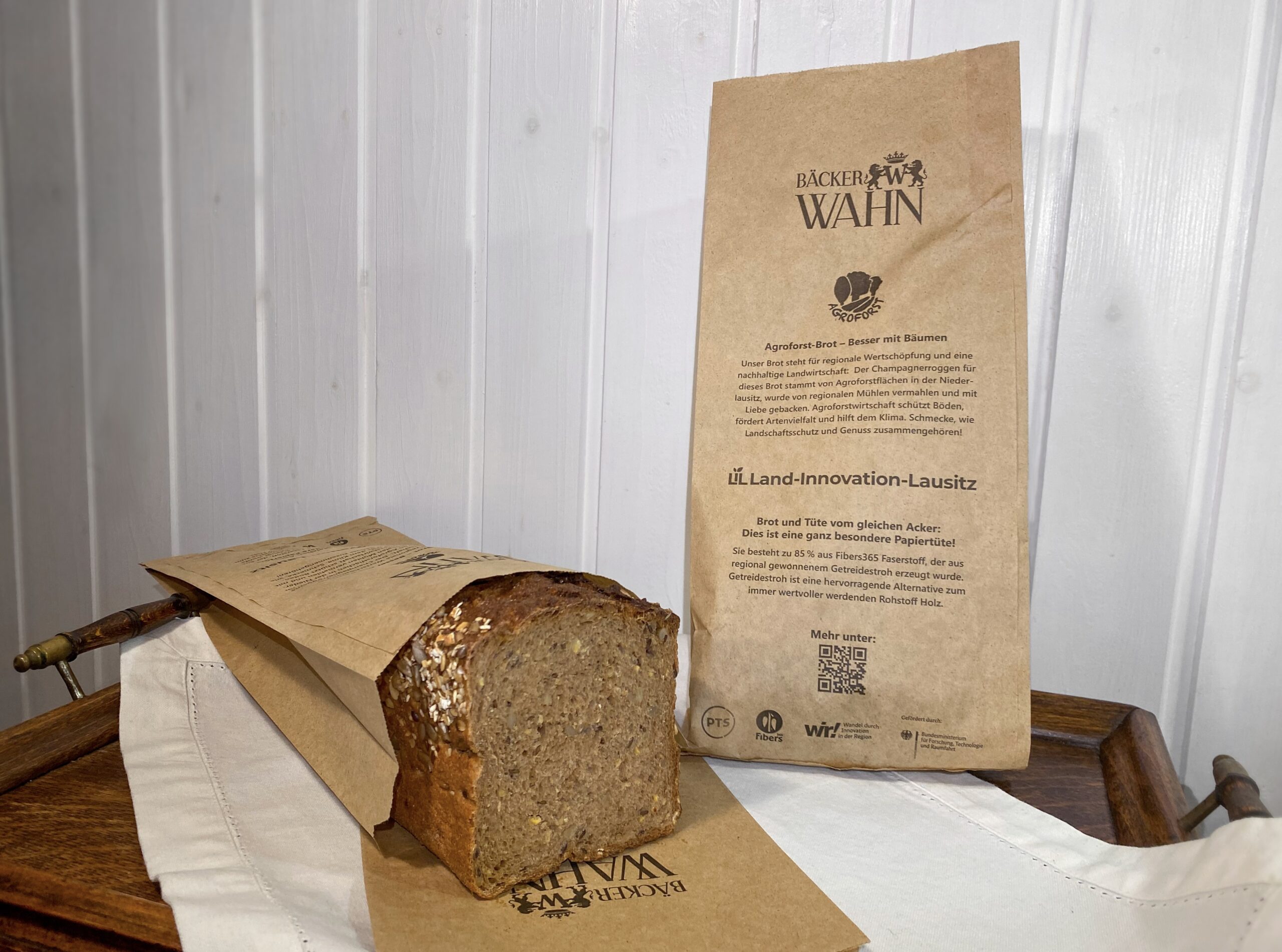 Seit dem Herbst 2025 – und nur für eine begrenzte Zeit – ist erneut das Agroforst-Brot aus der Lausitz erhältlich. Es wird zu 80 Prozent aus Mehl des Champagnerroggens aus der Agroforstwirtschaft von Landwirt Thomas Domin gebacken. Dieses Mal geht das Brot verpackt in Bäckertüten aus Getreidestroh über die Ladentheke. Zu kaufen gibt es das Brot in den 11 Bäcker Wahn-Filialen in der Lausitz und im Spreewald sowie im Hofladen des Landwirtschaftsbetriebes Domin.
