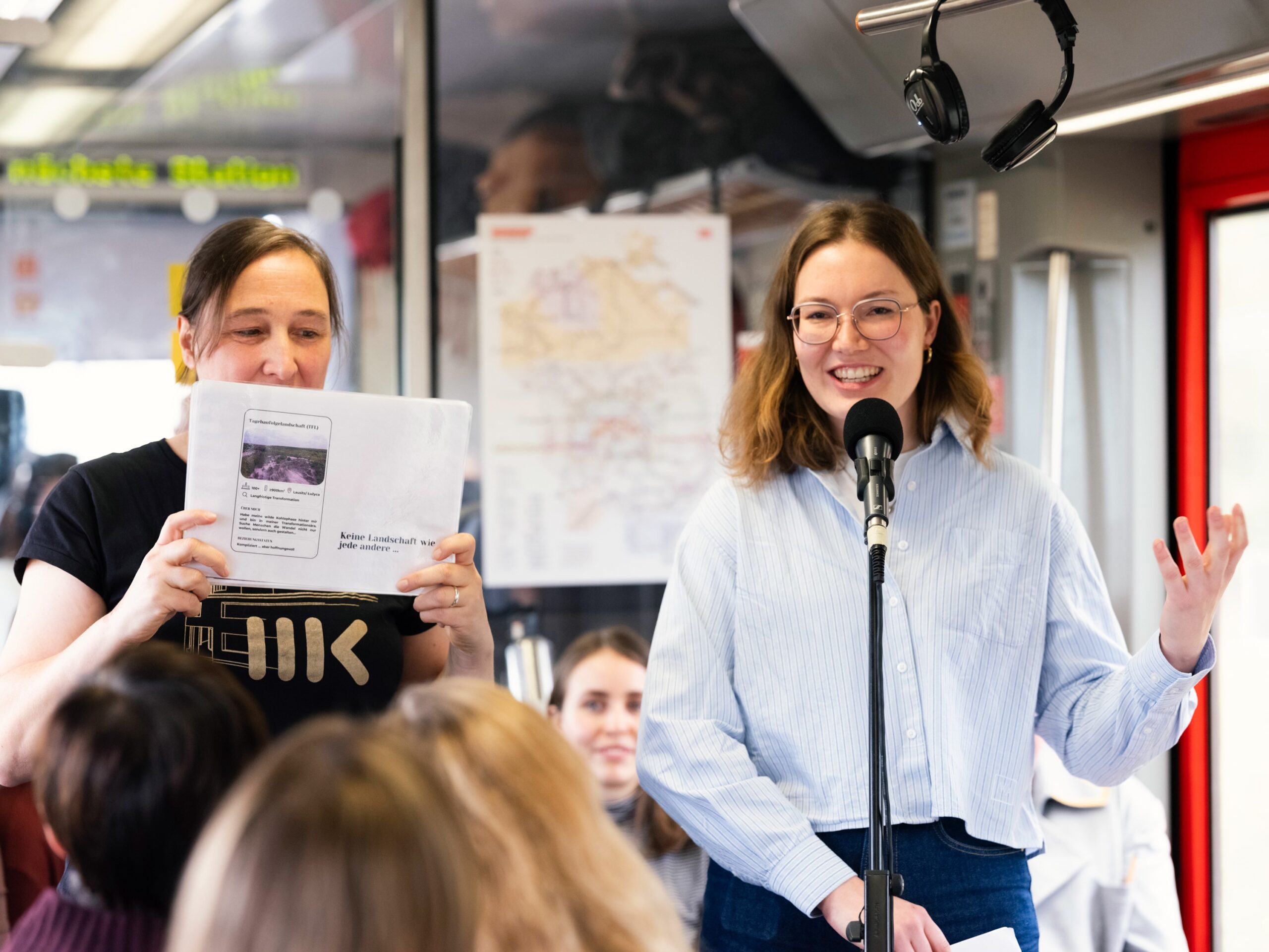 Im Science Slam von Mareike Herold (IHM) ging es um Tagebaufolgelandschaften, von Heidi Pinkepank (INIK) um die Bedeutung der Kultur im Strukturwandel, Antonia Grahlow-Sipeer (INIK) behandelte das Thema „Gruppenchat – Wer schreibt mit? – Frauen, Strukturwandel und Regionalentwicklung in der Lausitz“ und Susanne Schenider-Weller (INIK) das Thema „Industriekultur und Moderne Architektur“. Aber auch Lesungen, Gespräche und künstlerische Formate unter dem Motto „Was uns verbindet / Regionen machen Europa“ kamen im Wagon 1 des Zuges zusammen.