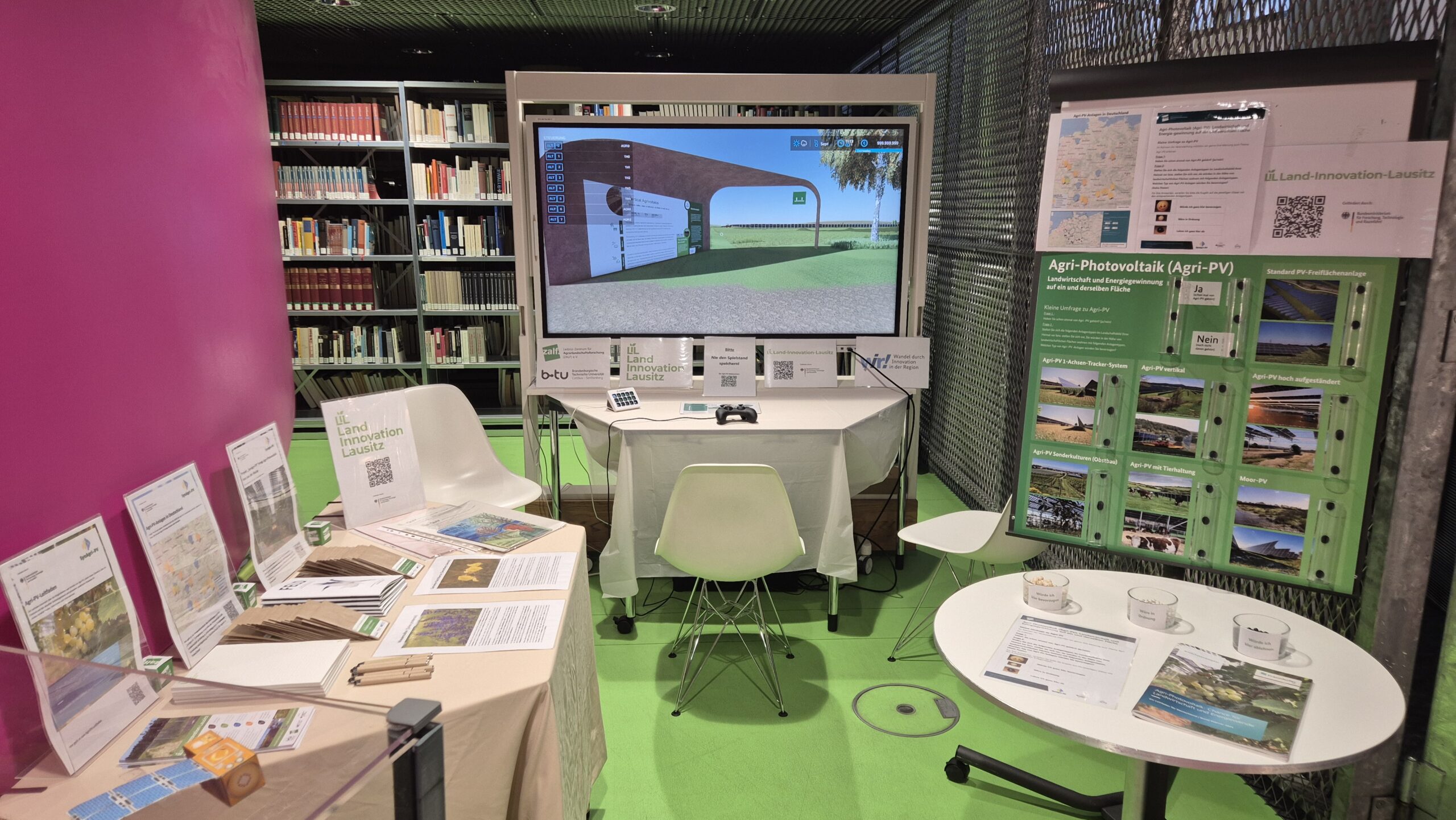 Im Untergeschoss des IKMZ fanden – trotz vermeintlich ‚versteckter‘ Lage – zahlreiche interessierte Besucherinnen und Besucher den Stand zu Land-Innovation Lausitz mit einer Vielfalt an Angeboten, die die einzelnen Projekte des WIR-Bündnisses vorstellten:
