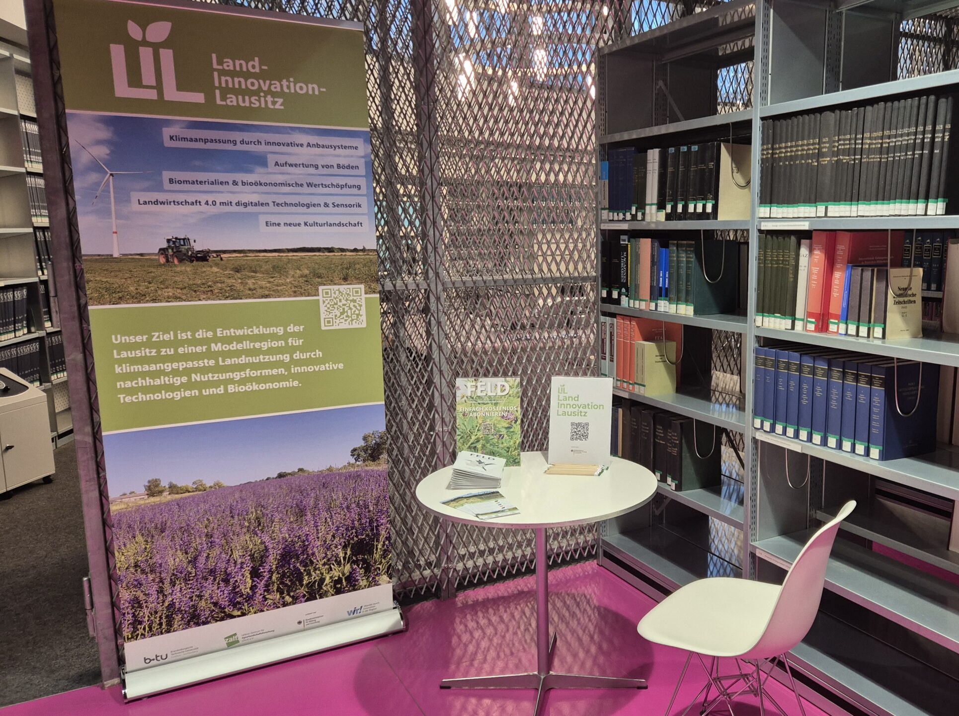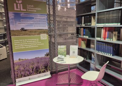 Im Untergeschoss des IKMZ fanden – trotz vermeintlich ‚versteckter‘ Lage – zahlreiche interessierte Besucherinnen und Besucher den Stand zu Land-Innovation Lausitz mit einer Vielfalt an Angeboten, die die einzelnen Projekte des WIR-Bündnisses vorstellten: