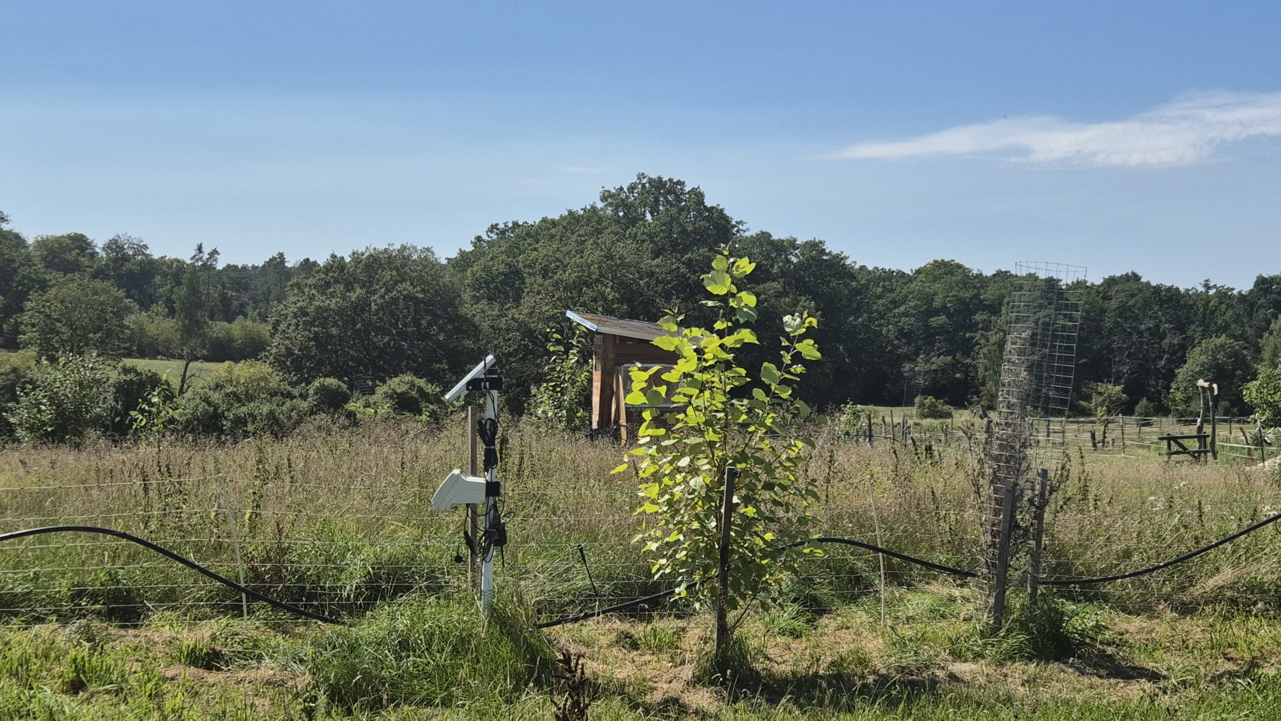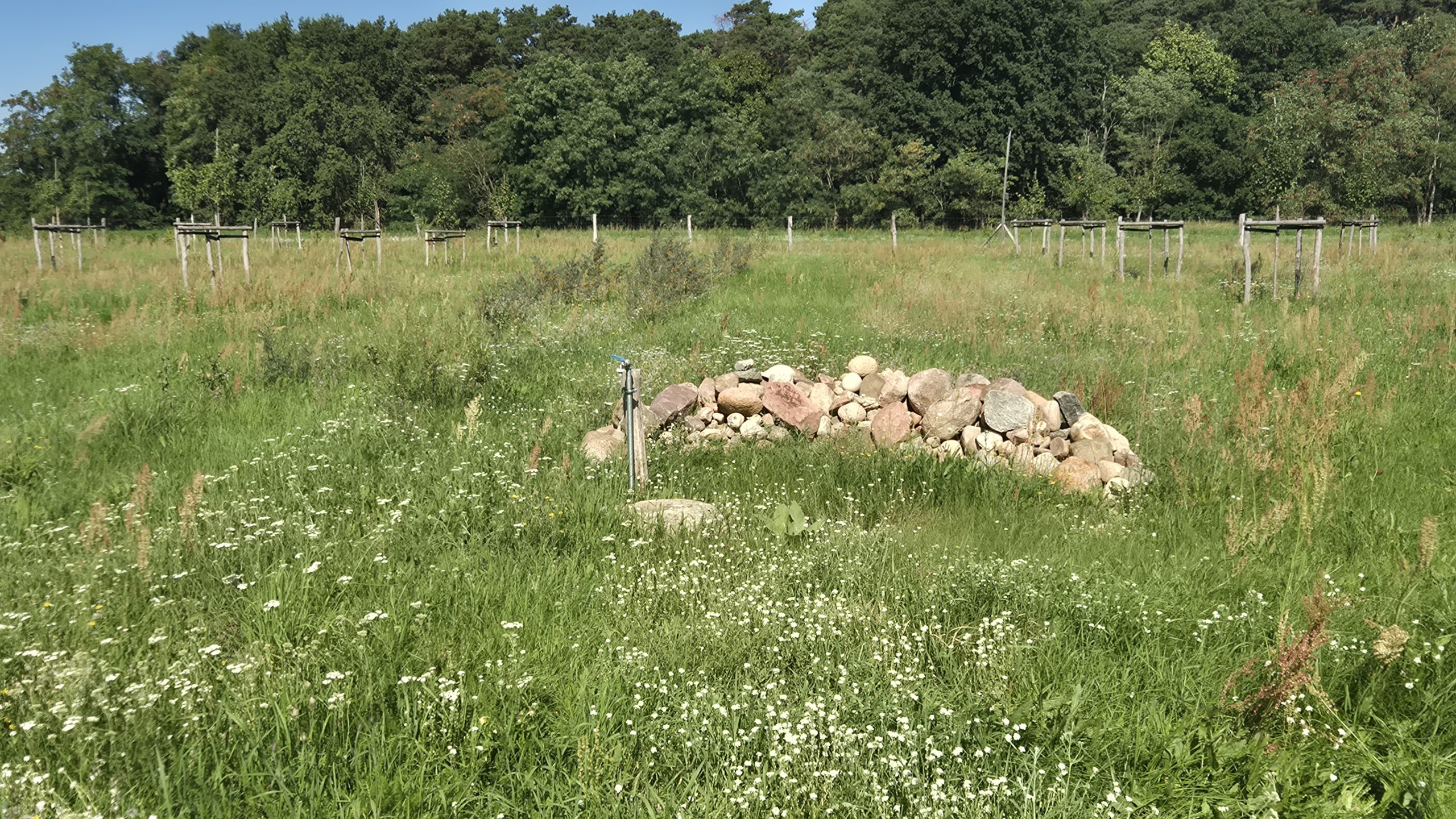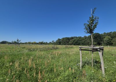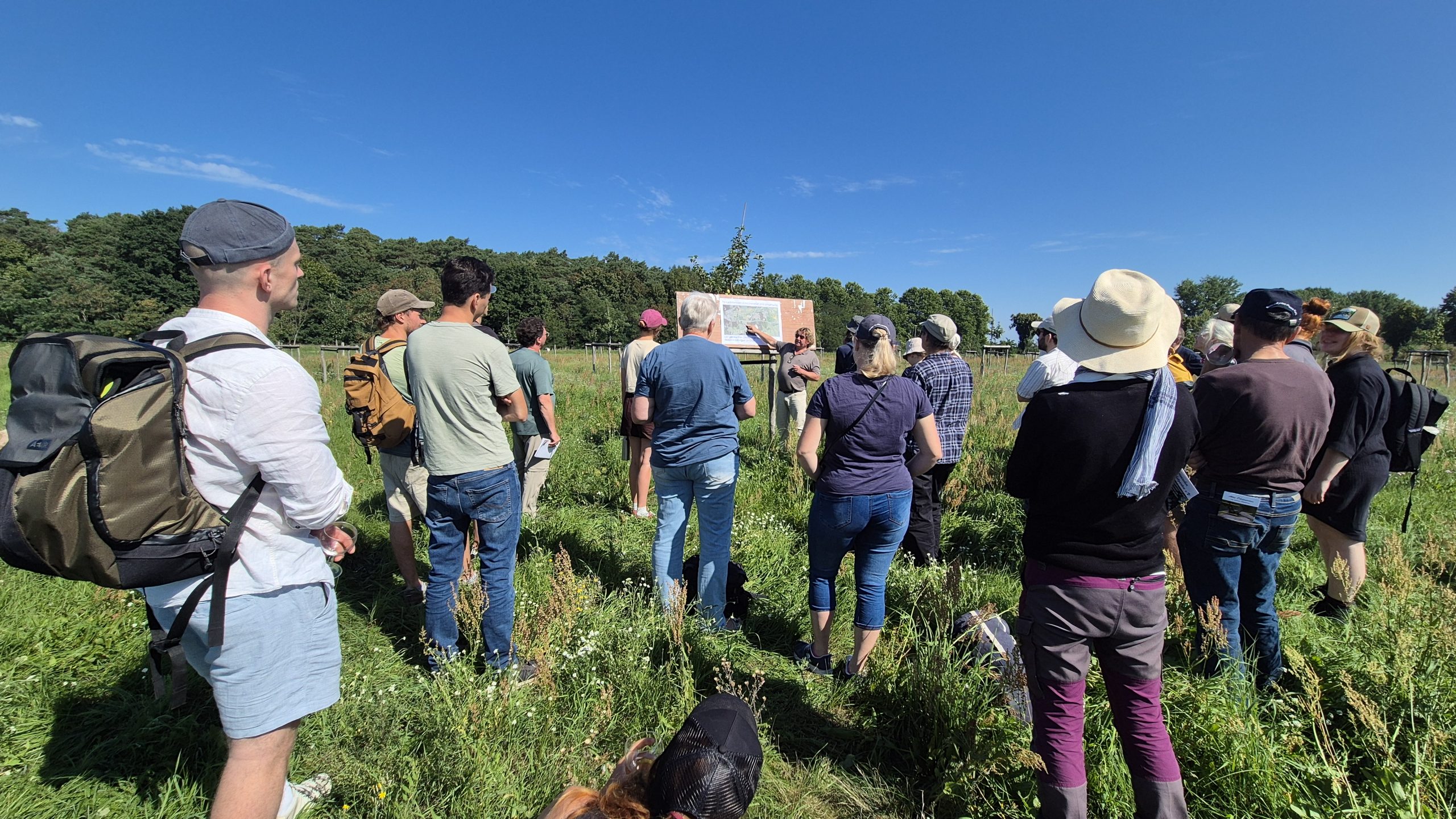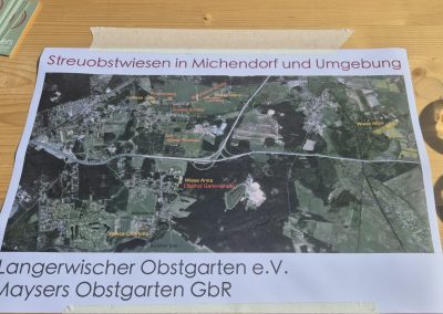 Zuerst ging es mit einem Reisebus zu einer Streuobstwiese des Familienbetriebes Maysers Obstgarten GbR. Der Betrieb arbeitet in einer engen Kooperation mit dem Langerwischer Obstgarten e. V., dessen Ziel es ist, neue Obstpflanzungen rund um Langerwisch anzulegen und bestehende zu pflegen, um obstbauliche Arten- und Sortenvielfalt zu erhalten sowie zu fördern und biologische Vielfalt zu schaffen. Gemeinschaftlich wird das Obst dort geerntet und verwertet. Vor Ort durften die Exkursionsteilnehmer*innen verwertetes Obst in Form verschiedener Säfte sogar probieren – eine willkommene Erfrischung bei den Temperaturen – natürlich gibt es weitaus mehr Produkte. Besonders interessant war das dort integrierte, teils unterirdische Bewässerungssystem über einen Brunnen. Streuobstbetriebe sind eine traditionelle Form der Agroforstwirtschaft.