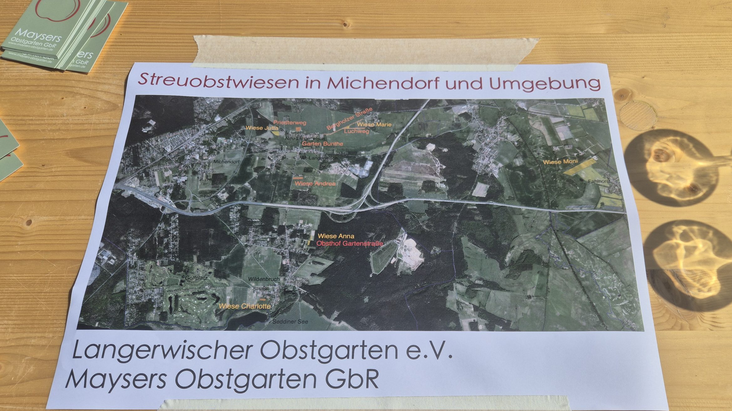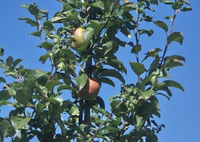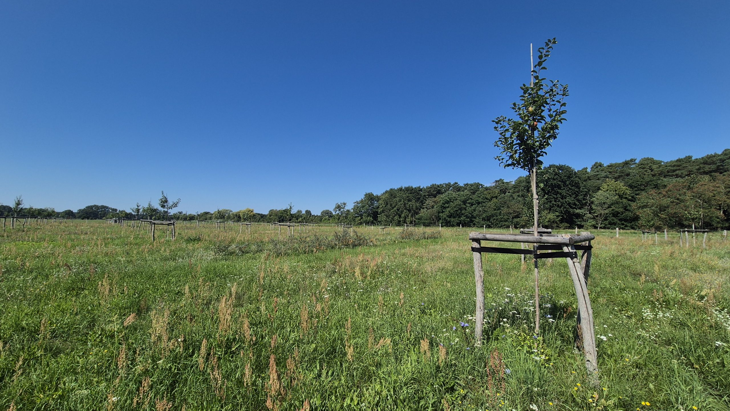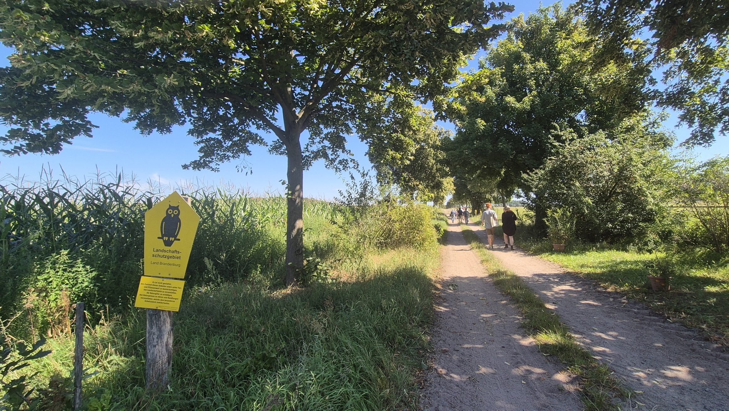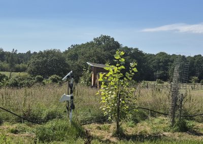 Zuerst ging es mit einem Reisebus zu einer Streuobstwiese des Familienbetriebes Maysers Obstgarten GbR. Der Betrieb arbeitet in einer engen Kooperation mit dem Langerwischer Obstgarten e. V., dessen Ziel es ist, neue Obstpflanzungen rund um Langerwisch anzulegen und bestehende zu pflegen, um obstbauliche Arten- und Sortenvielfalt zu erhalten sowie zu fördern und biologische Vielfalt zu schaffen. Gemeinschaftlich wird das Obst dort geerntet und verwertet. Vor Ort durften die Exkursionsteilnehmer*innen verwertetes Obst in Form verschiedener Säfte sogar probieren – eine willkommene Erfrischung bei den Temperaturen – natürlich gibt es weitaus mehr Produkte. Besonders interessant war das dort integrierte, teils unterirdische Bewässerungssystem über einen Brunnen. Streuobstbetriebe sind eine traditionelle Form der Agroforstwirtschaft.
