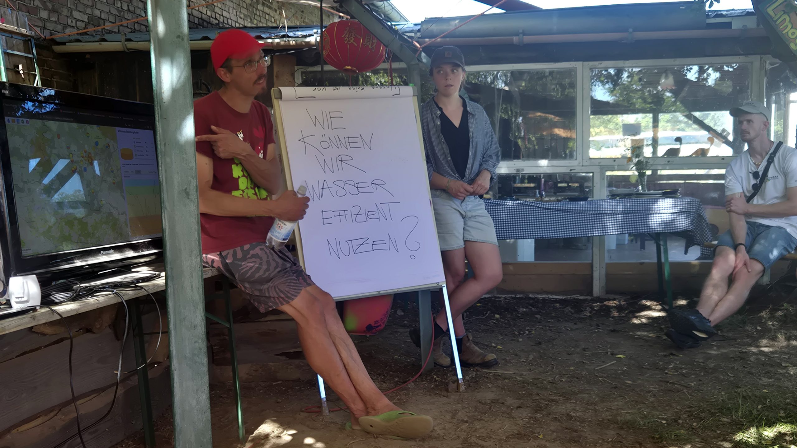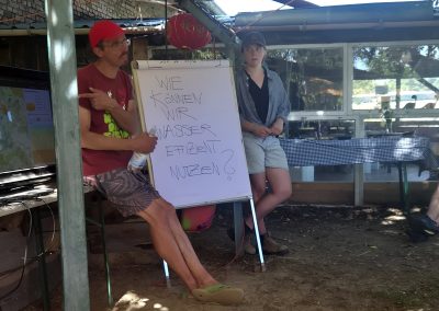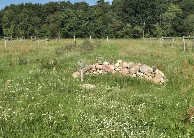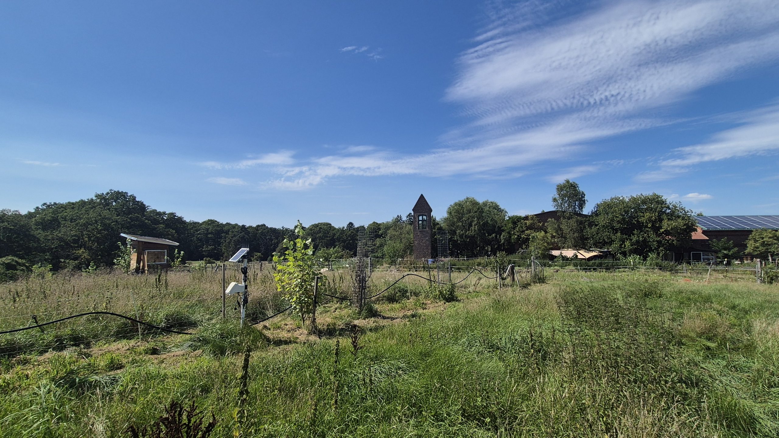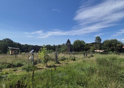 Abschließend ging es mit dem Bus zum Arensnest bei Wiesenburg. Die Schäferei Arensnest eG wurde 2019 gegründet, um den Hof, die dazugehörigen Gebäude und das umliegende Land in genossenschaftliche Obhut zu bringen. Auf dem Gelände befindet sich ein 3-Seiten-Hof mit Wohngebäuden, Stall, Werkstatt und Scheunen. Außer den Flächen für Gemüseanbau, Beerenhecken und eine Streuobstwiese für die Selbstversorgung gibt es noch Platz für tierische Mitbewohner: Schafe, Pferde, Vögel, Bienen und Hühner. Zu dem Hof gehört eine Landwirtschaft mit 14 Hektar magerem Grünland, 1 Hektar Acker und ein Agroforstsystem. Auf den Weideflächen wurden 500 Gehölze (u. a. 2023 Esskastanien auf einer Weide und alte Apfelsorten) gepflanzt, um die Bodenfruchtbarkeit, Wasserqualität, Biodiversität und das Mikroklima zu verbessern. Mit der Zeit wird durch die Humusbildung durch Laub und Wurzeln die Bodenqualität gesteigert (Humusaufbau bisher um 0,5%). Mittels einer Bodenprobe wurde diese Humusbildung im Boden vor Ort sichtbar. Auch im Arensnest sorgen die Bäume für Schatten, Windschutz und den Erhalt der Bodenfeuchte, denn ihre Wurzeln befördern Wasser aus der Tiefe. Spannend war hier ebenso das integrierte Bewässerungssystem über eine Zisterne, das oberhalb der Flächen angebracht ist. In der Zisterne sowie an einigen anderen Messstellen sind Sensoren angebracht. Die Daten werden im Rahmen des Citizen-Science Projektes Wassermeisterei gesammelt und in einer Wasserdatenkarte dargestellt.