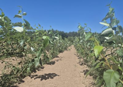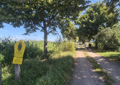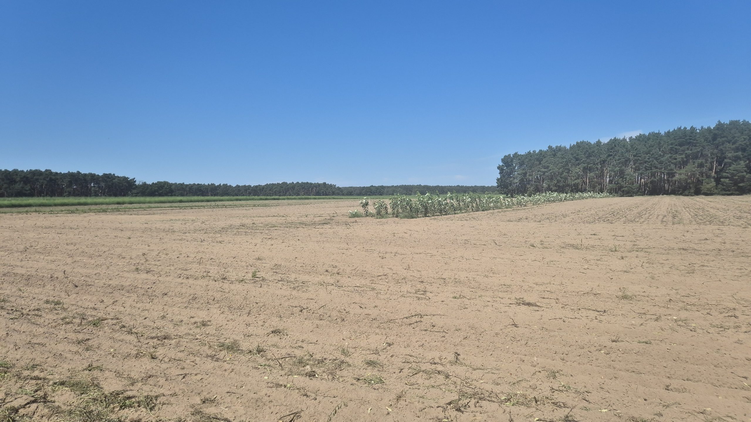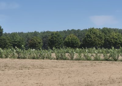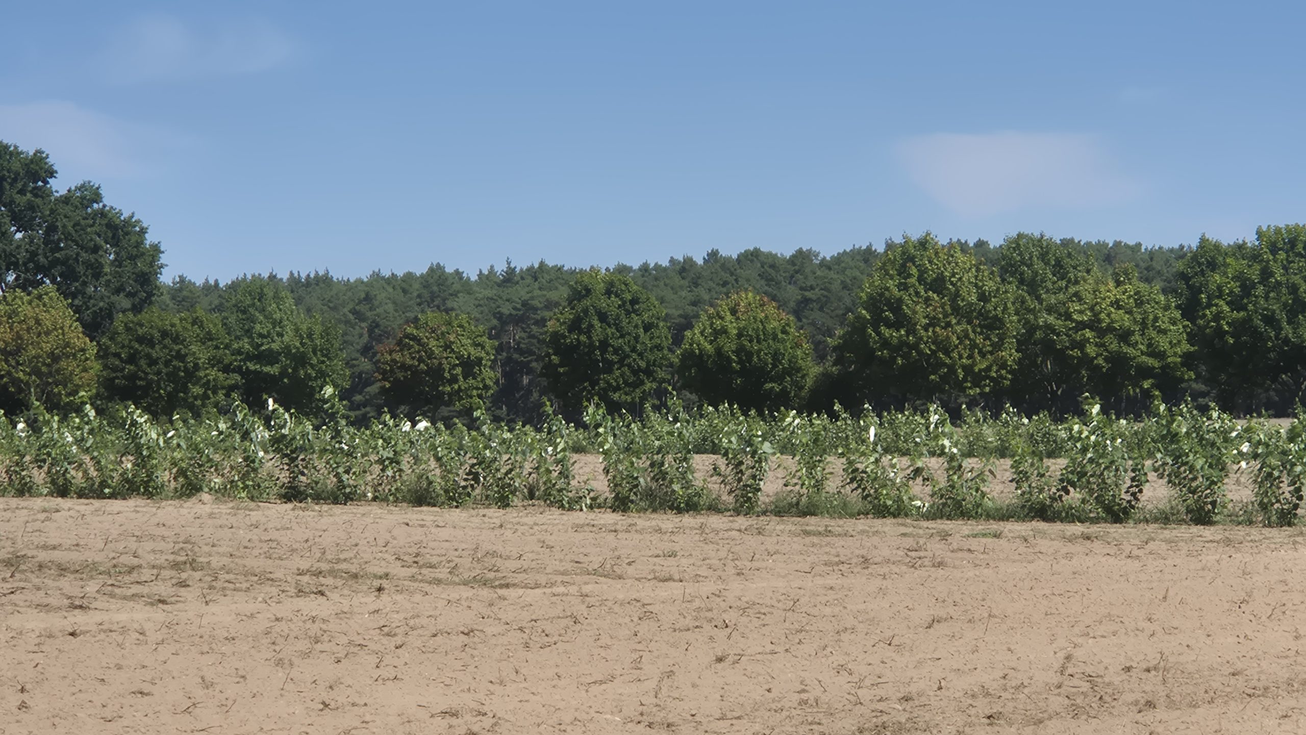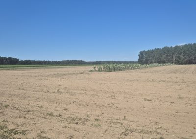 Weiter ging es dann zum Betrieb Thomas Seehaus bei Beelitz. Auf seinem Landwirtschaftsbetrieb wurden im April 2025 im Rahmen des im Bundesprogramm Biologische Vielfalt geförderten Naturschutzvorhabens SEBAS Pappeln für ein neues Agroforstsystem gepflanzt. Aus den gepflanzten Pappeln soll Pflanzenkohle hergestellt werden. Für den Herbst sind weitere Pflanzungen von Wildobst und Werthölzern geplant und entlang der Gehölzstreifen sollen Blühstreifen entstehen. All diese Maßnahmen fördern die biologische Vielfalt. Eine besondere Herausforderung an diesem Standort ist der sandige Boden einschließlich der Winderosion – hier können die Bäume einen positiven Effekt erzielen: Schutz vor Wind und „Speicher“ für die Bodenfeuchtigkeit.